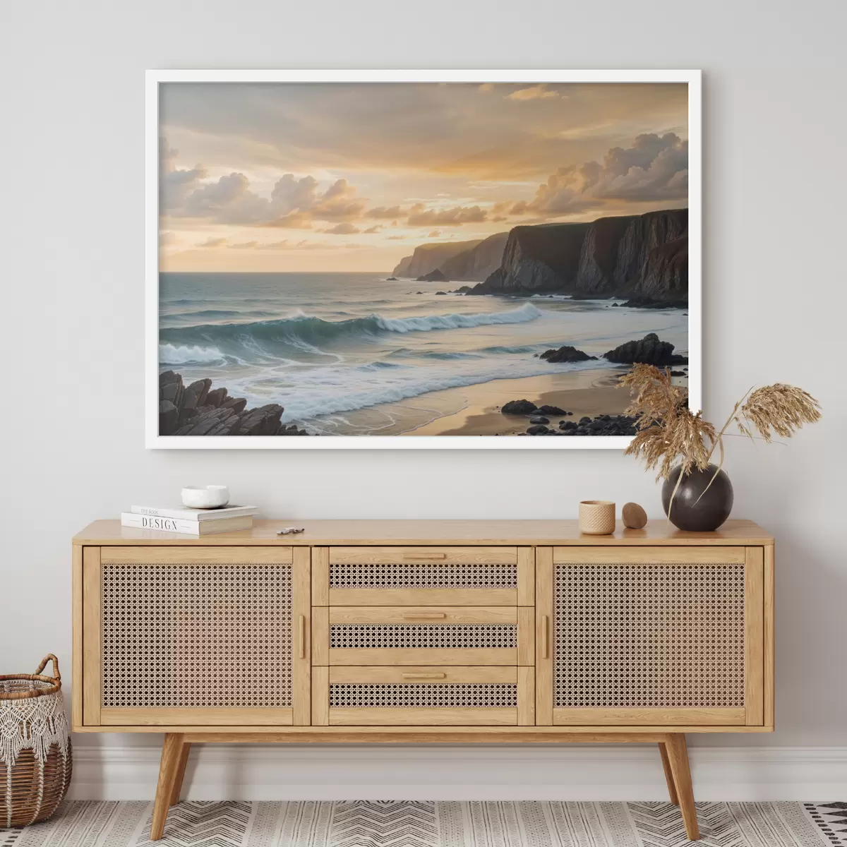 Poster Eine malerische Küstenlandschaft mit dramatischen Klippen, tosenden Wellen und einem farbenfrohen Sonnenuntergangshimmel Nr f40176