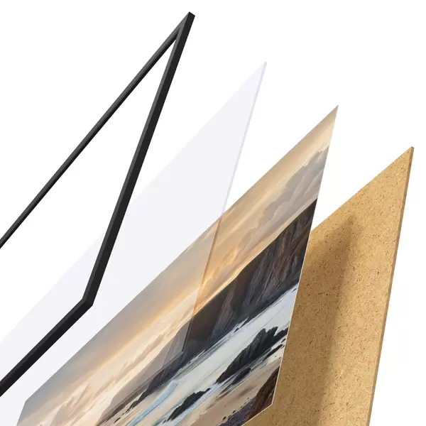 Das Poster besteht aus einem Rahmen, Plexiglas, einem gedruckten Bild und einer Rückwand aus Spanplatten. Dank der Halterungen auf der Rückseite kann das Poster sofort an die Wand gehängt werden.