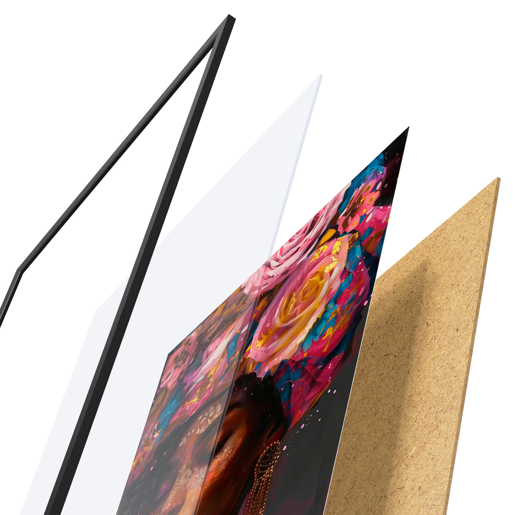 Das Poster besteht aus einem Rahmen, Plexiglas, einem gedruckten Bild und einer Rückwand aus Spanplatten. Dank der Halterungen auf der Rückseite kann das Poster sofort an die Wand gehängt werden.