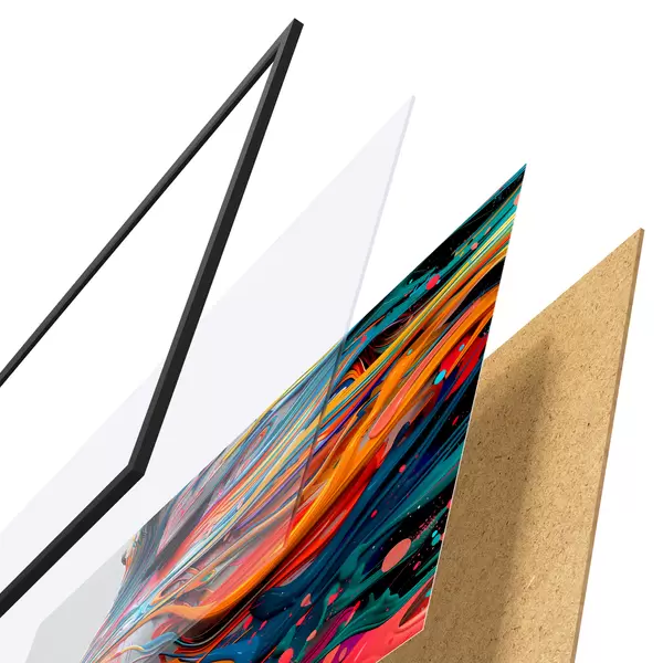Das Poster besteht aus einem Rahmen, Plexiglas, einem gedruckten Bild und einer Rückwand aus Spanplatten. Dank der Halterungen auf der Rückseite kann das Poster sofort an die Wand gehängt werden.