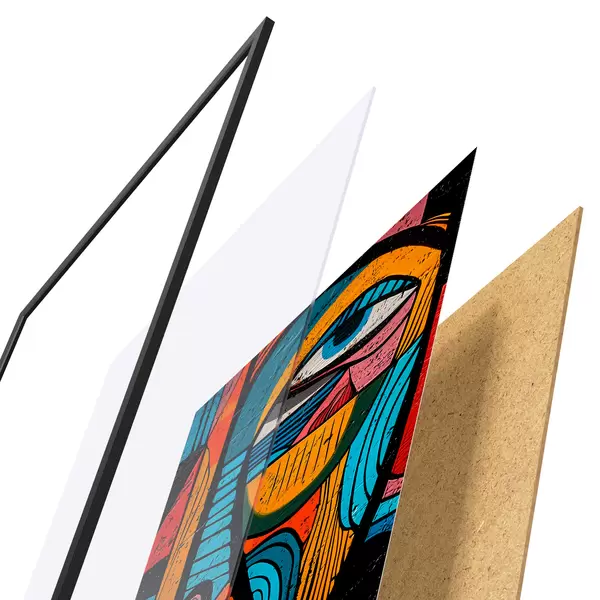 Das Poster besteht aus einem Rahmen, Plexiglas, einem gedruckten Bild und einer Rückwand aus Spanplatten. Dank der Halterungen auf der Rückseite kann das Poster sofort an die Wand gehängt werden.