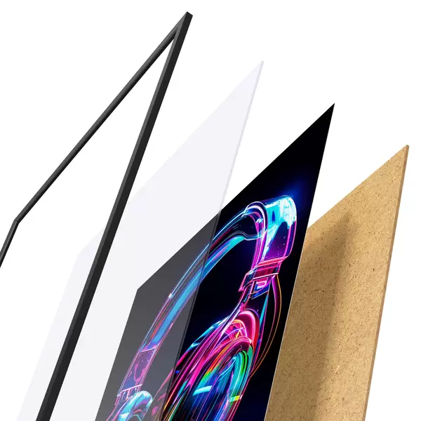 Das Poster besteht aus einem Rahmen, Plexiglas, einem gedruckten Bild und einer Rückwand aus Spanplatten. Dank der Halterungen auf der Rückseite kann das Poster sofort an die Wand gehängt werden.
