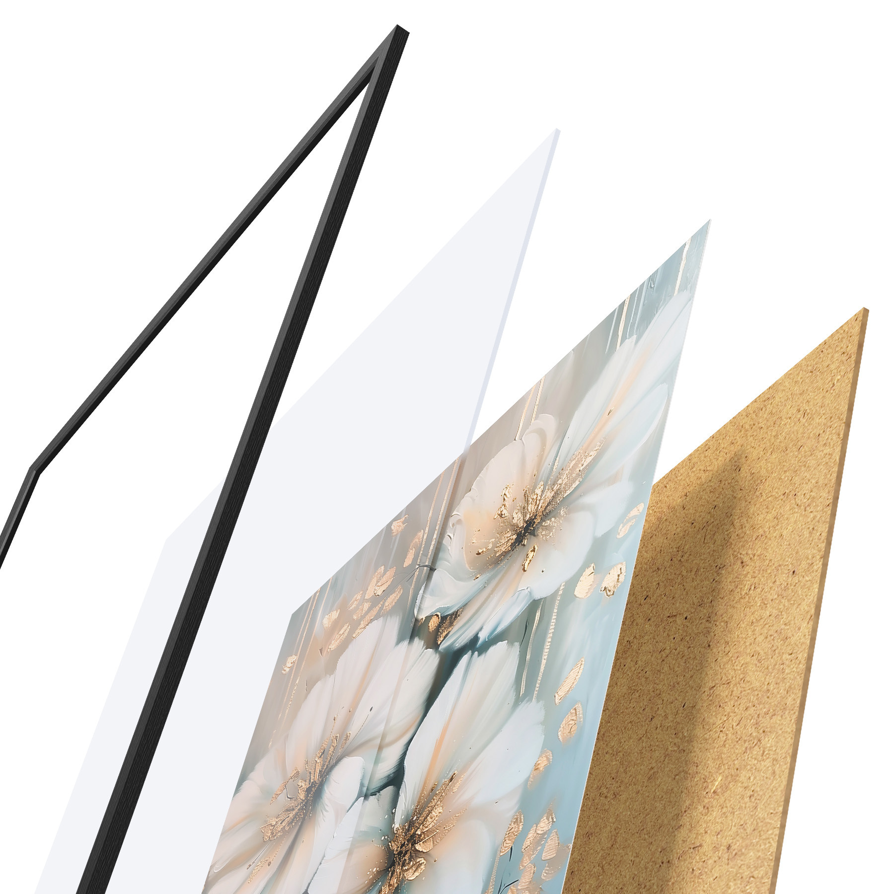 Das Poster besteht aus einem Rahmen, Plexiglas, einem gedruckten Bild und einer Rückwand aus Spanplatten. Dank der Halterungen auf der Rückseite kann das Poster sofort an die Wand gehängt werden.
