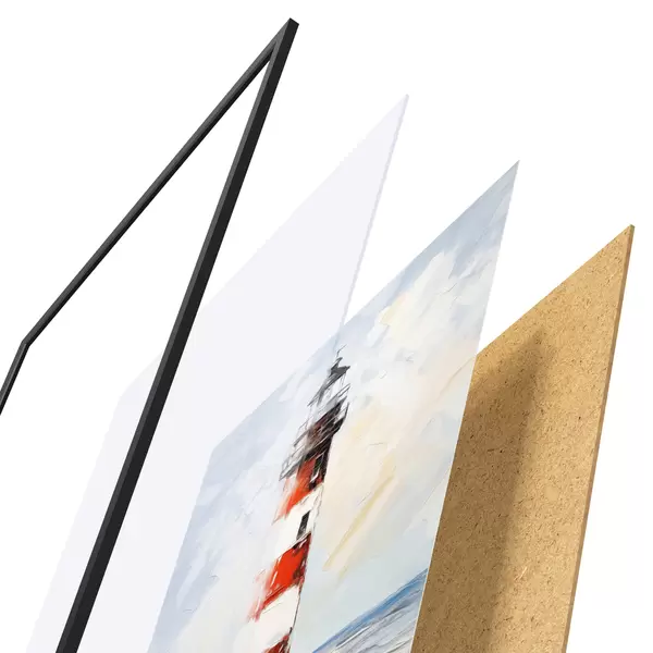Das Poster besteht aus einem Rahmen, Plexiglas, einem gedruckten Bild und einer Rückwand aus Spanplatten. Dank der Halterungen auf der Rückseite kann das Poster sofort an die Wand gehängt werden.