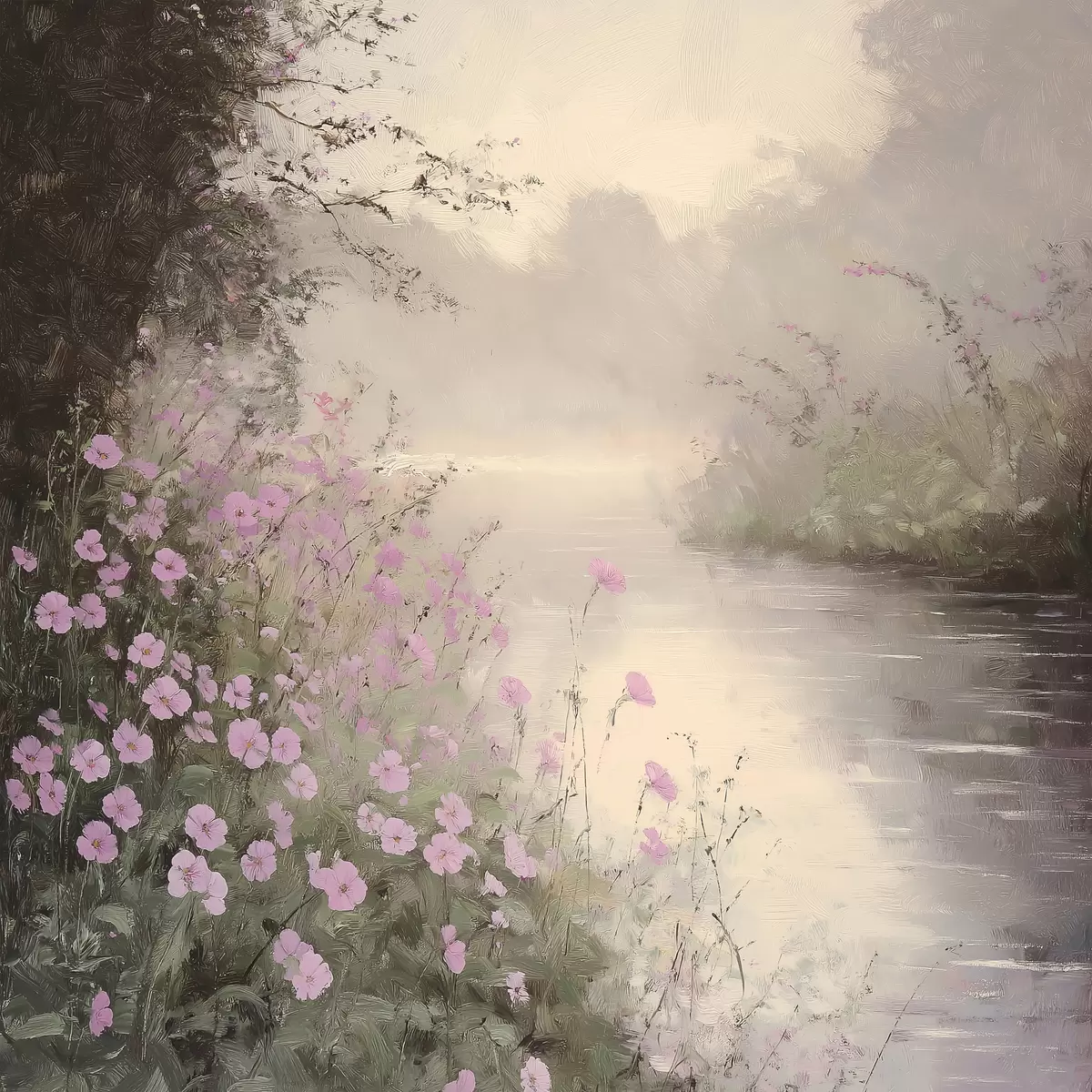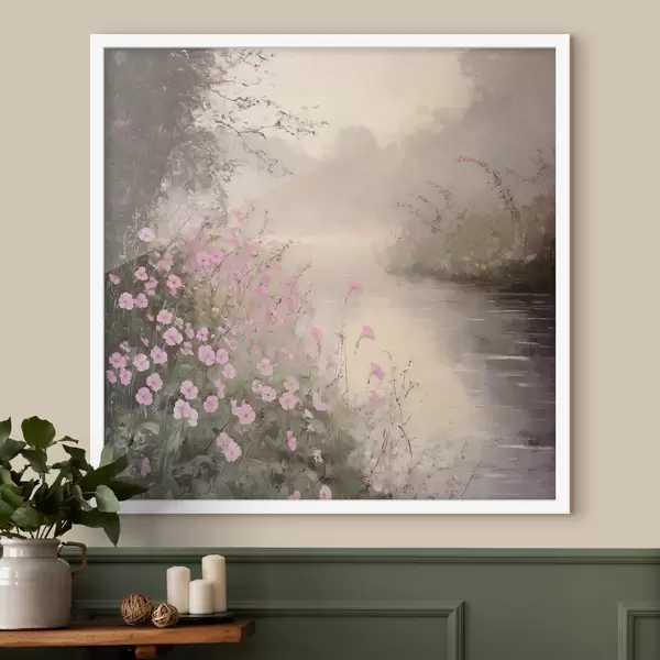 Poster See mit rosa Blumen, Sonnenaufgang, Ölzeichnung, pastellbeige Farben, Nebel f40229