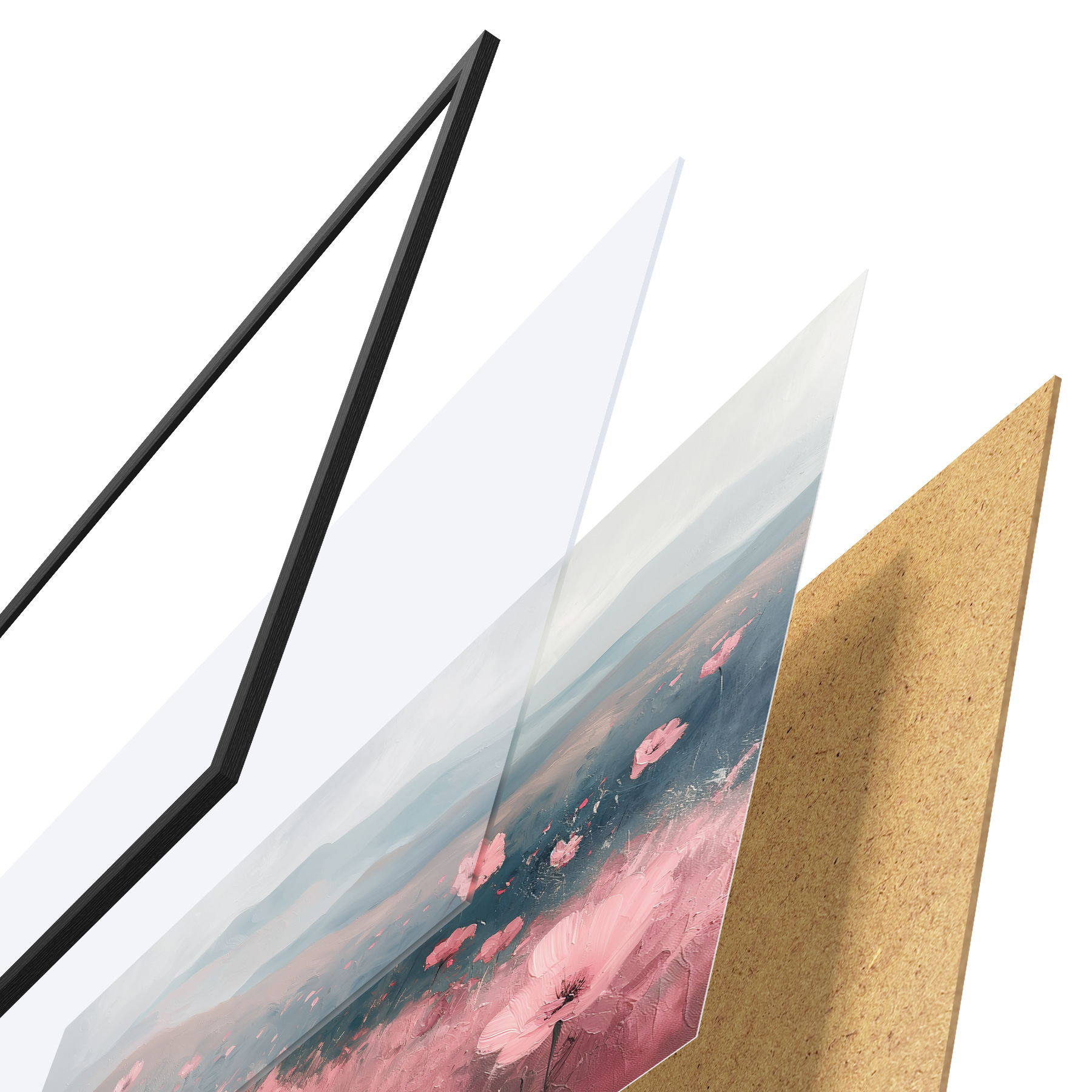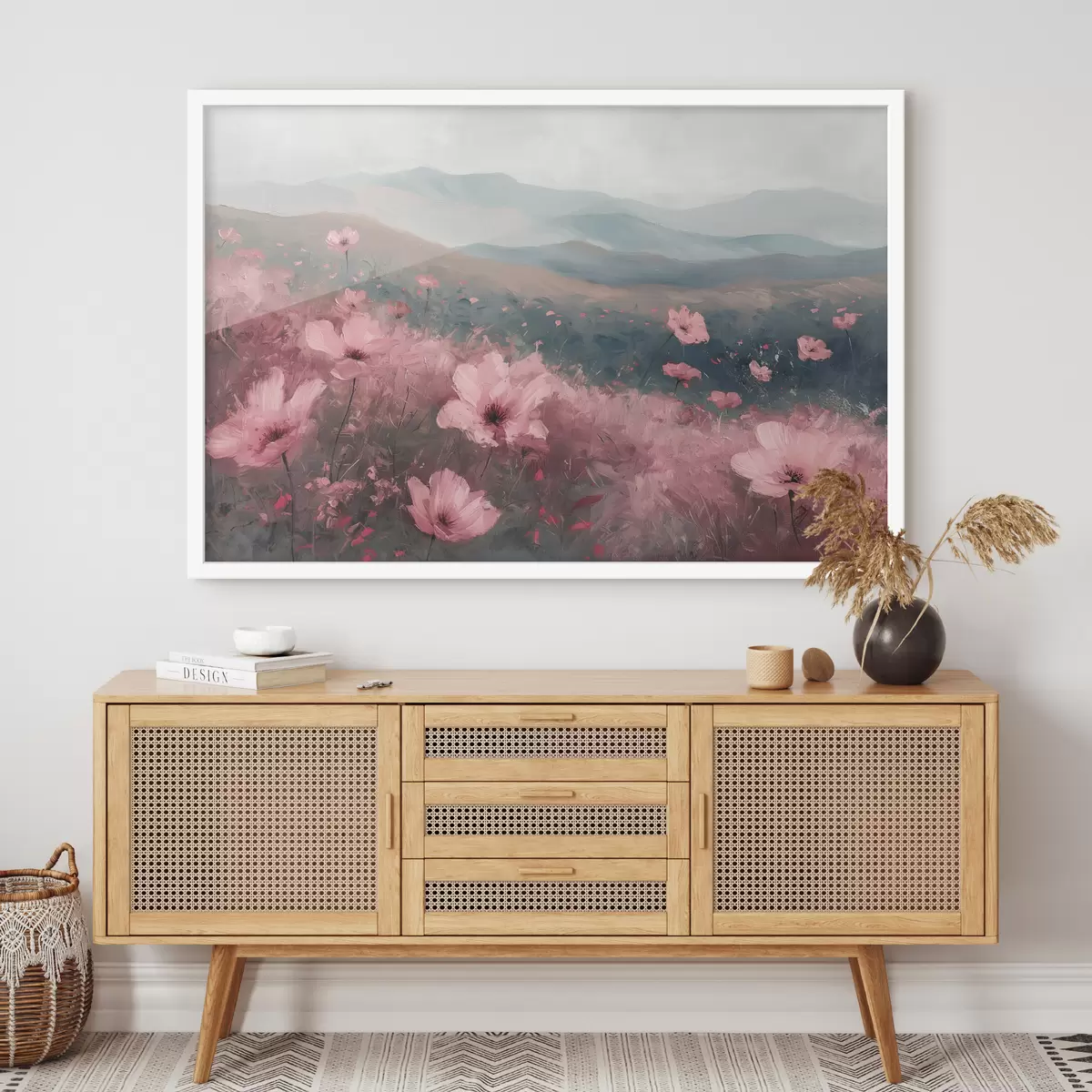 Poster Rosa Blumen auf der Wiese, Naturlandschaft, Berge, Ölgemälde, lebendige Pinselstriche Nr f40233