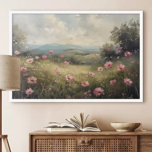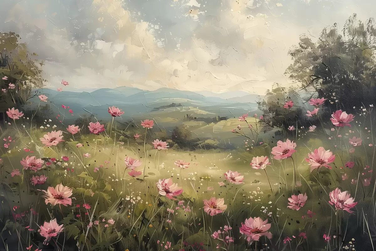 Poster Wiese mit rosa Blumen, grünem Gras, Naturlandschaft, Himmel mit Wolken, Acrylzeichnung Nr f40234