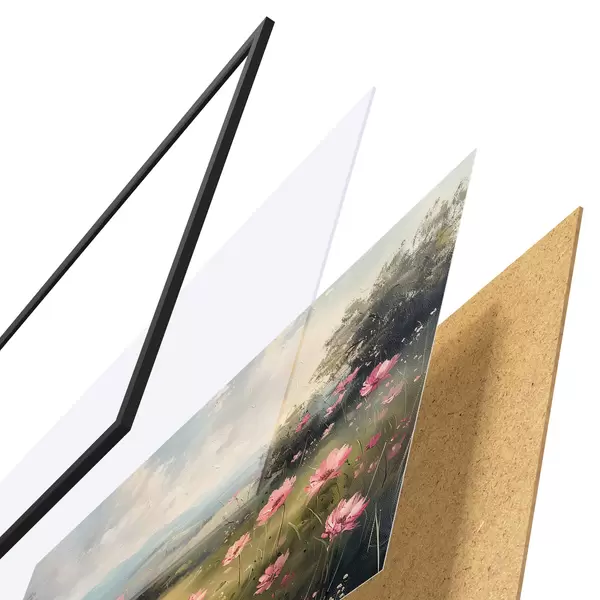 Das Poster besteht aus einem Rahmen, Plexiglas, einem gedruckten Bild und einer Rückwand aus Spanplatten. Dank der Halterungen auf der Rückseite kann das Poster sofort an die Wand gehängt werden.