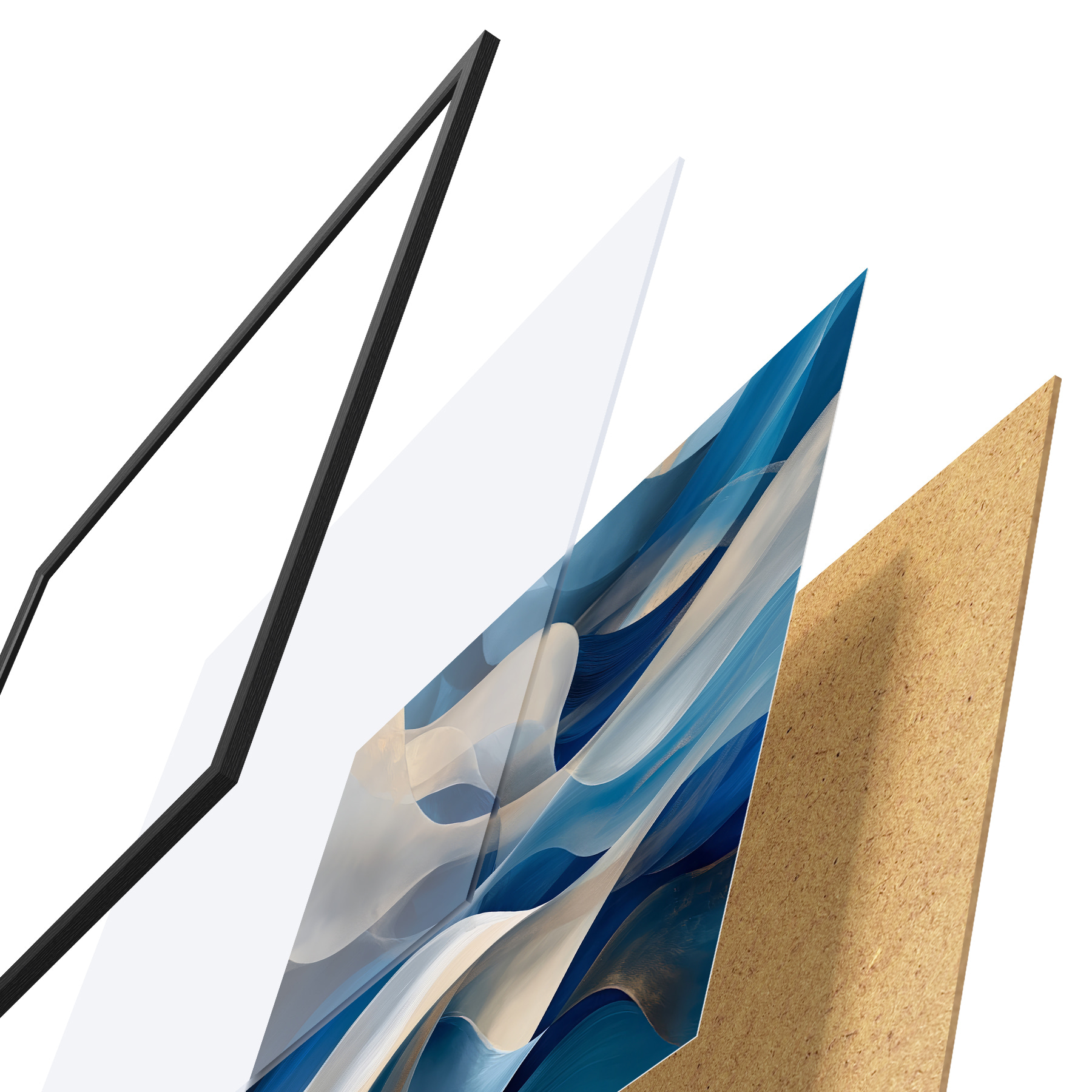 Das Poster besteht aus einem Rahmen, Plexiglas, einem gedruckten Bild und einer Rückwand aus Spanplatten. Dank der Halterungen auf der Rückseite kann das Poster sofort an die Wand gehängt werden.