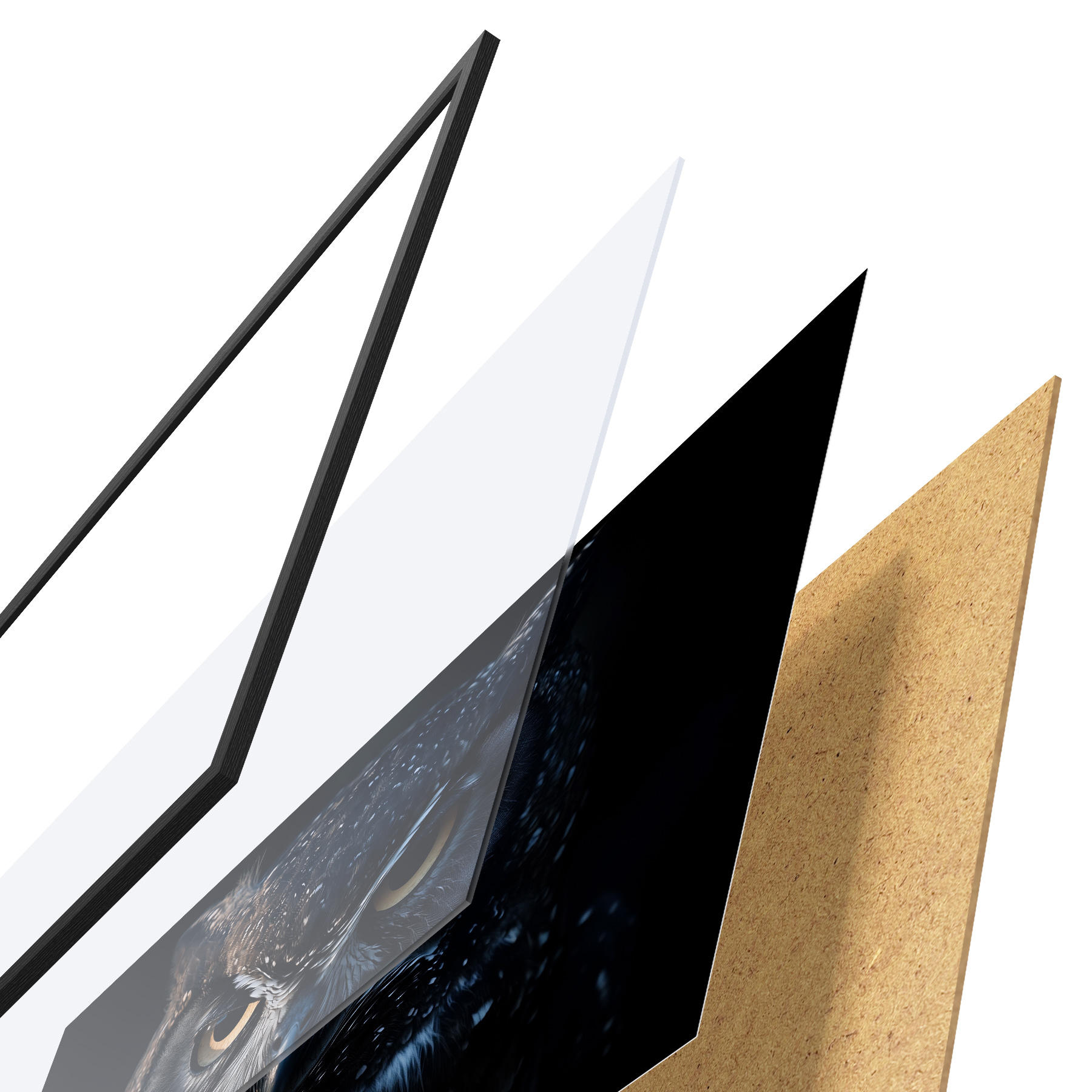 Das Poster besteht aus einem Rahmen, Plexiglas, einem gedruckten Bild und einer Rückwand aus Spanplatten. Dank der Halterungen auf der Rückseite kann das Poster sofort an die Wand gehängt werden.