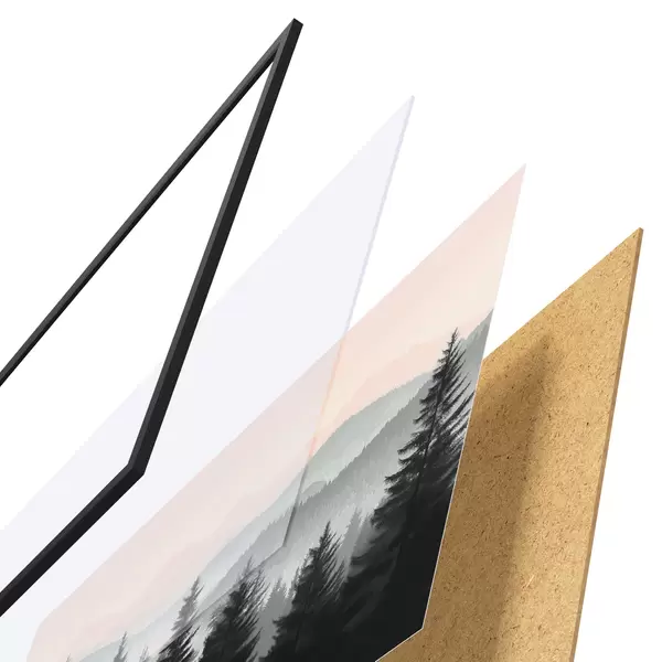 Das Poster besteht aus einem Rahmen, Plexiglas, einem gedruckten Bild und einer Rückwand aus Spanplatten. Dank der Halterungen auf der Rückseite kann das Poster sofort an die Wand gehängt werden.