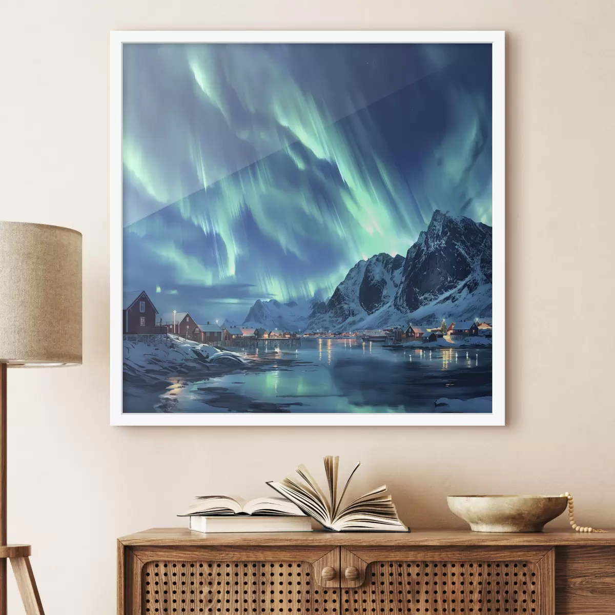 Poster Norwegen Winterdorf, Nordlichter, Nachthimmel Nr f40300