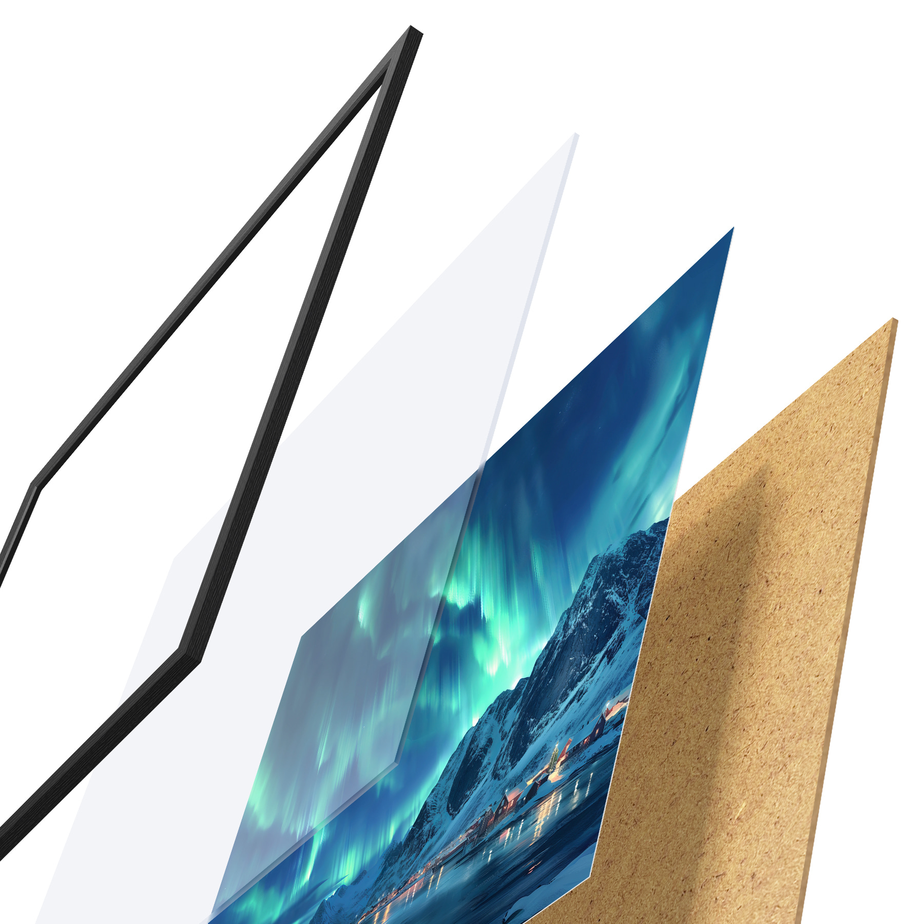 Das Poster besteht aus einem Rahmen, Plexiglas, einem gedruckten Bild und einer Rückwand aus Spanplatten. Dank der Halterungen auf der Rückseite kann das Poster sofort an die Wand gehängt werden.