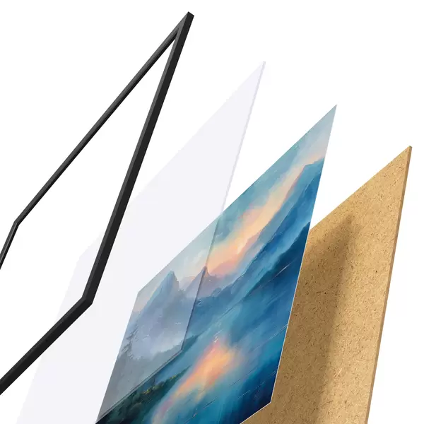 Das Poster besteht aus einem Rahmen, Plexiglas, einem gedruckten Bild und einer Rückwand aus Spanplatten. Dank der Halterungen auf der Rückseite kann das Poster sofort an die Wand gehängt werden.