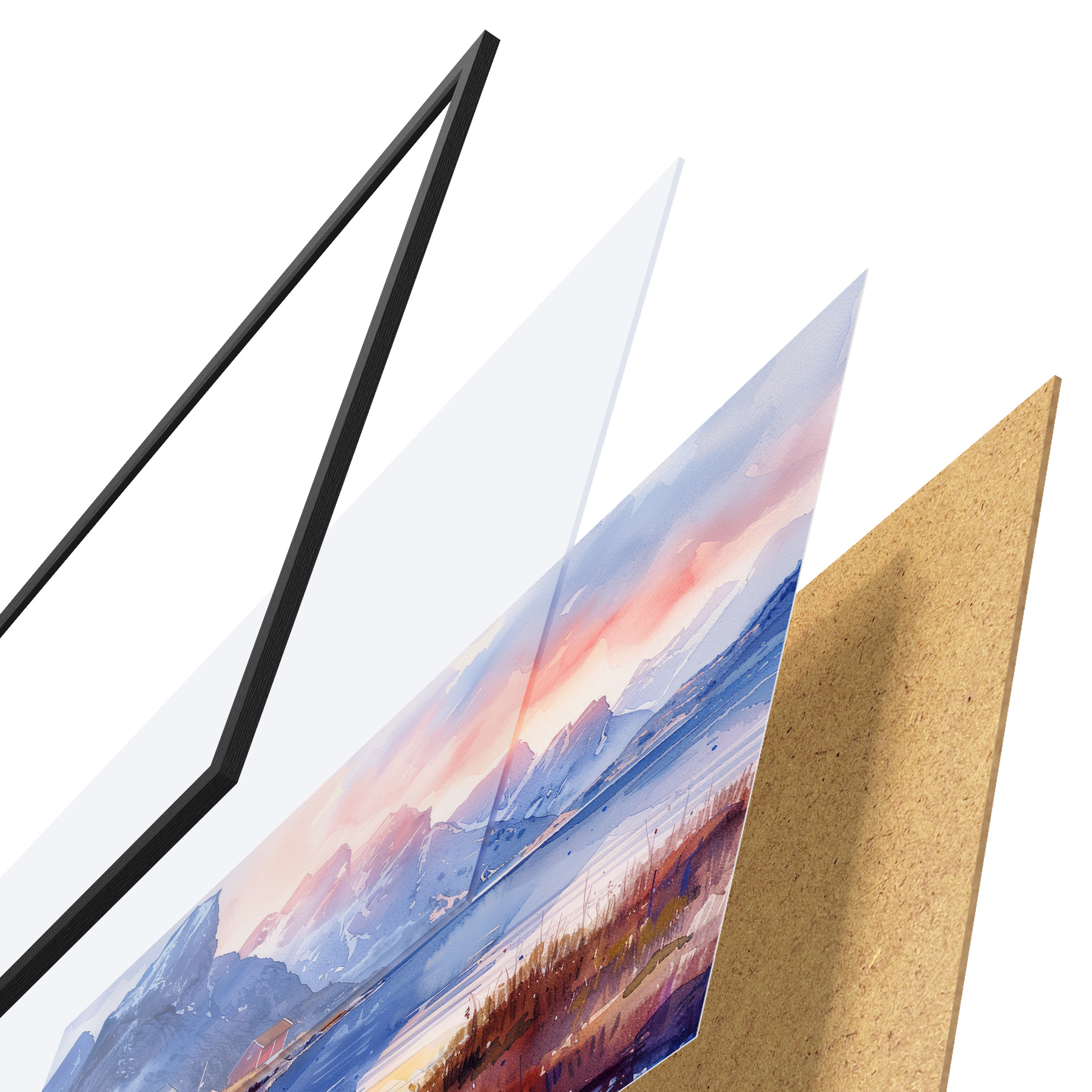 Das Poster besteht aus einem Rahmen, Plexiglas, einem gedruckten Bild und einer Rückwand aus Spanplatten. Dank der Halterungen auf der Rückseite kann das Poster sofort an die Wand gehängt werden.