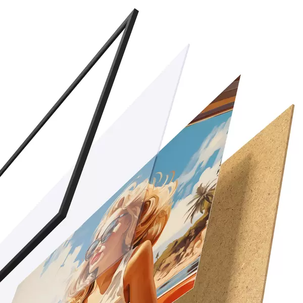 Das Poster besteht aus einem Rahmen, Plexiglas, einem gedruckten Bild und einer Rückwand aus Spanplatten. Dank der Halterungen auf der Rückseite kann das Poster sofort an die Wand gehängt werden.