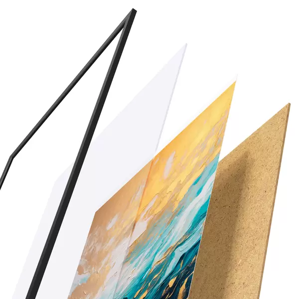 Das Poster besteht aus einem Rahmen, Plexiglas, einem gedruckten Bild und einer Rückwand aus Spanplatten. Dank der Halterungen auf der Rückseite kann das Poster sofort an die Wand gehängt werden.