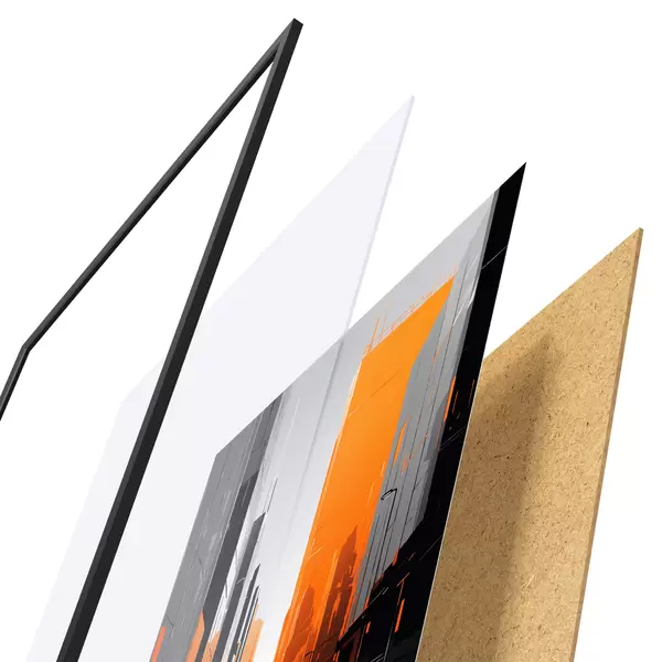 Das Poster besteht aus einem Rahmen, Plexiglas, einem gedruckten Bild und einer Rückwand aus Spanplatten. Dank der Halterungen auf der Rückseite kann das Poster sofort an die Wand gehängt werden.