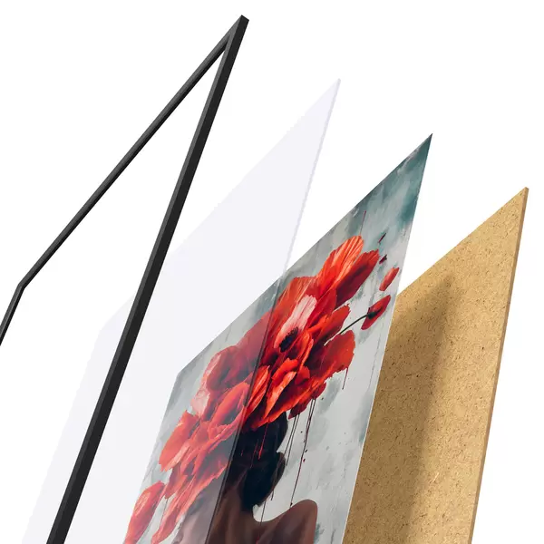 Das Poster besteht aus einem Rahmen, Plexiglas, einem gedruckten Bild und einer Rückwand aus Spanplatten. Dank der Halterungen auf der Rückseite kann das Poster sofort an die Wand gehängt werden.