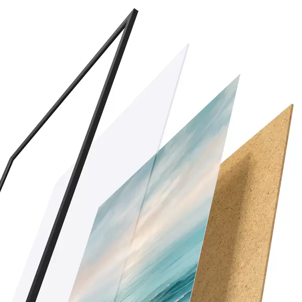 Das Poster besteht aus einem Rahmen, Plexiglas, einem gedruckten Bild und einer Rückwand aus Spanplatten. Dank der Halterungen auf der Rückseite kann das Poster sofort an die Wand gehängt werden.