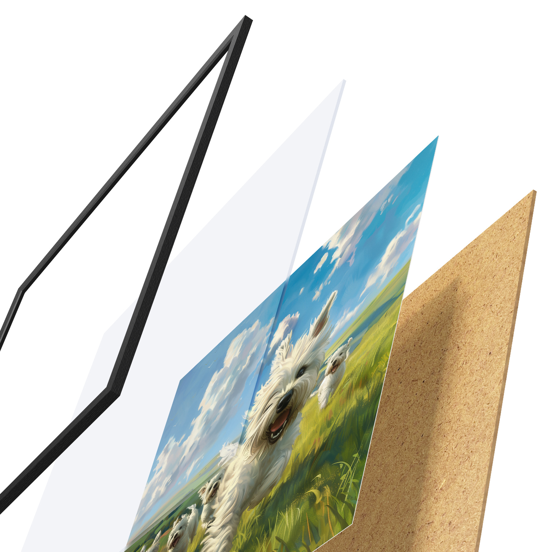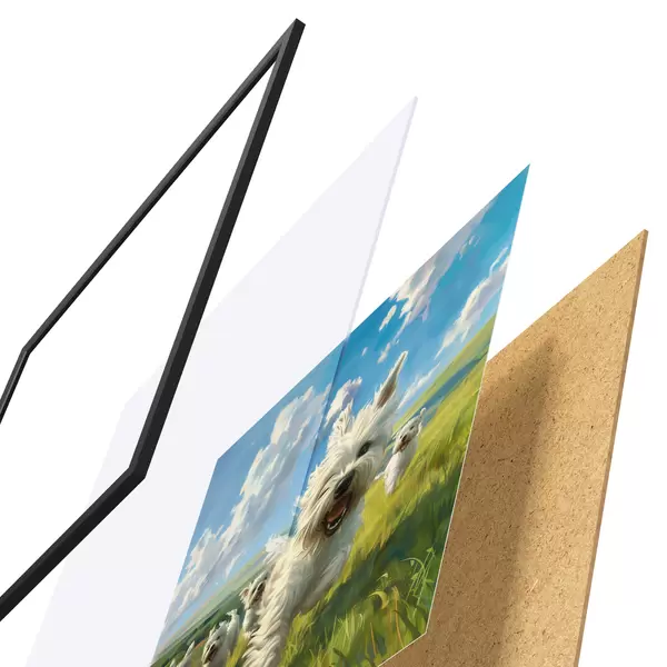 Das Poster besteht aus einem Rahmen, Plexiglas, einem gedruckten Bild und einer Rückwand aus Spanplatten. Dank der Halterungen auf der Rückseite kann das Poster sofort an die Wand gehängt werden.