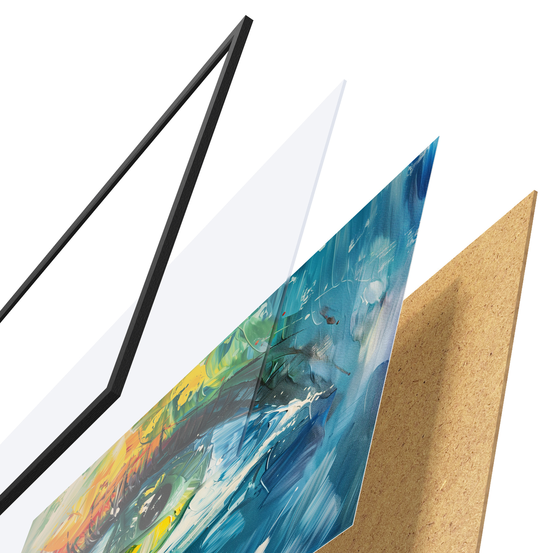 Das Poster besteht aus einem Rahmen, Plexiglas, einem gedruckten Bild und einer Rückwand aus Spanplatten. Dank der Halterungen auf der Rückseite kann das Poster sofort an die Wand gehängt werden.