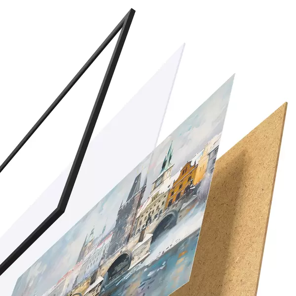 Das Poster besteht aus einem Rahmen, Plexiglas, einem gedruckten Bild und einer Rückwand aus Spanplatten. Dank der Halterungen auf der Rückseite kann das Poster sofort an die Wand gehängt werden.