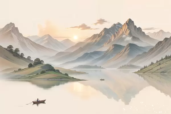 Poster Eine ruhige Landschaft mit einem See, in dessen Hintergrund sich Berge spiegeln, und einem kleinen Boot auf dem ruhigen Wasser Nr f40391