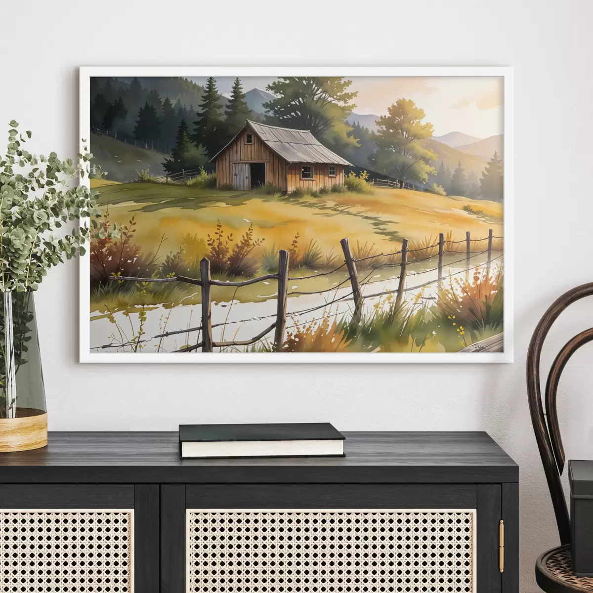 Poster Ein altes Holzhaus in ländlicher Umgebung, umgeben von einer Wiese, Pinien und Bergen f40394