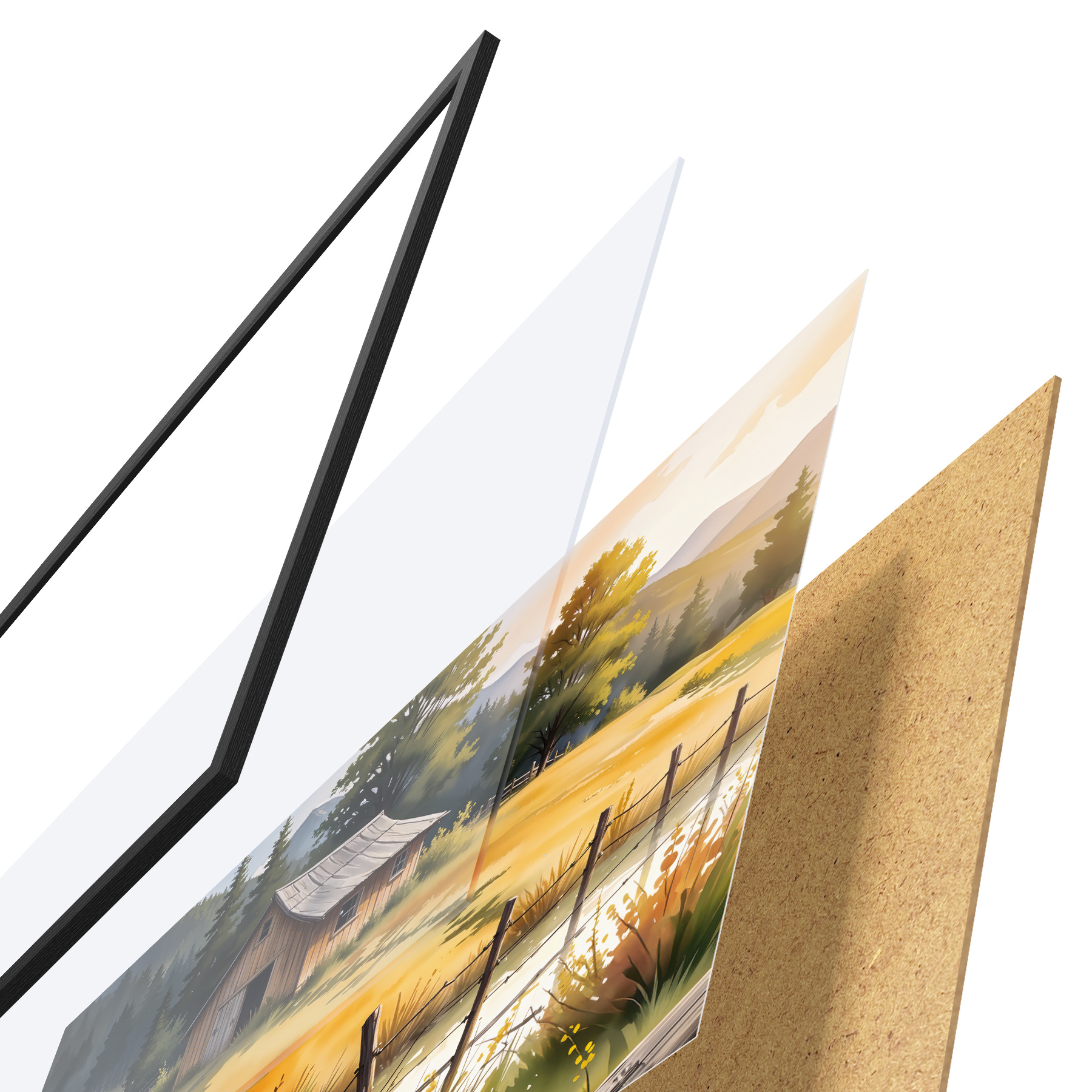 Das Poster besteht aus einem Rahmen, Plexiglas, einem gedruckten Bild und einer Rückwand aus Spanplatten. Dank der Halterungen auf der Rückseite kann das Poster sofort an die Wand gehängt werden.