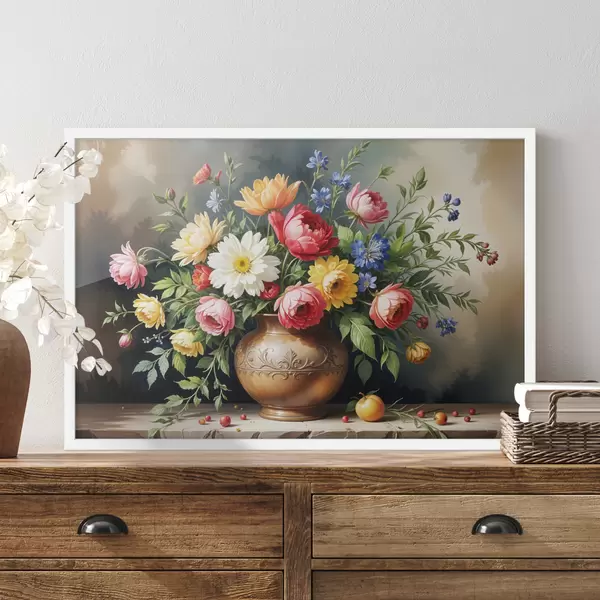 Poster Ein lebendiges Gemälde eines Straußes bunter Blumen, darunter rote Rosen, gelbe Narzissen und weiße Gänseblümchen Nr f40395
