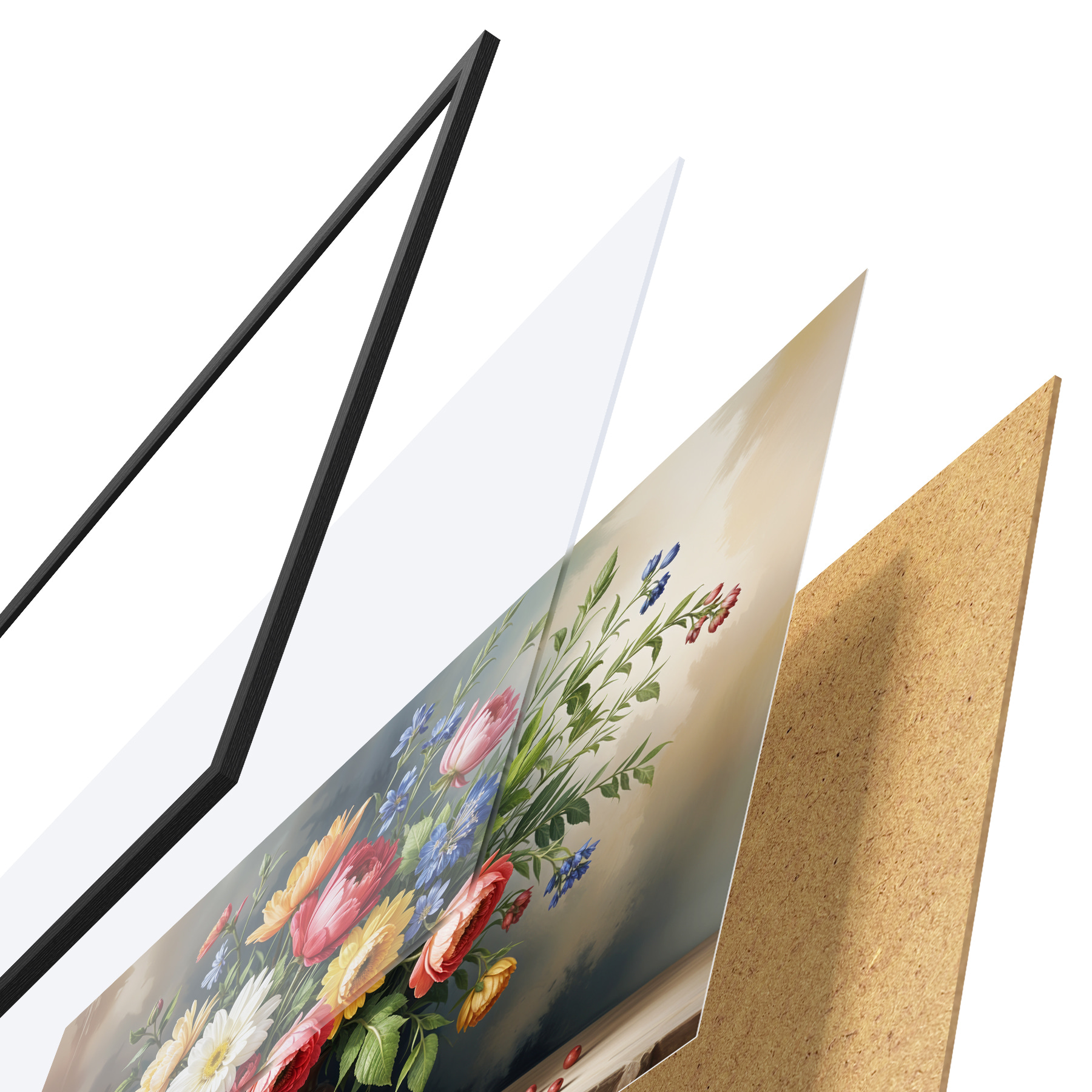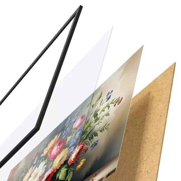 Das Poster besteht aus einem Rahmen, Plexiglas, einem gedruckten Bild und einer Rückwand aus Spanplatten. Dank der Halterungen auf der Rückseite kann das Poster sofort an die Wand gehängt werden.