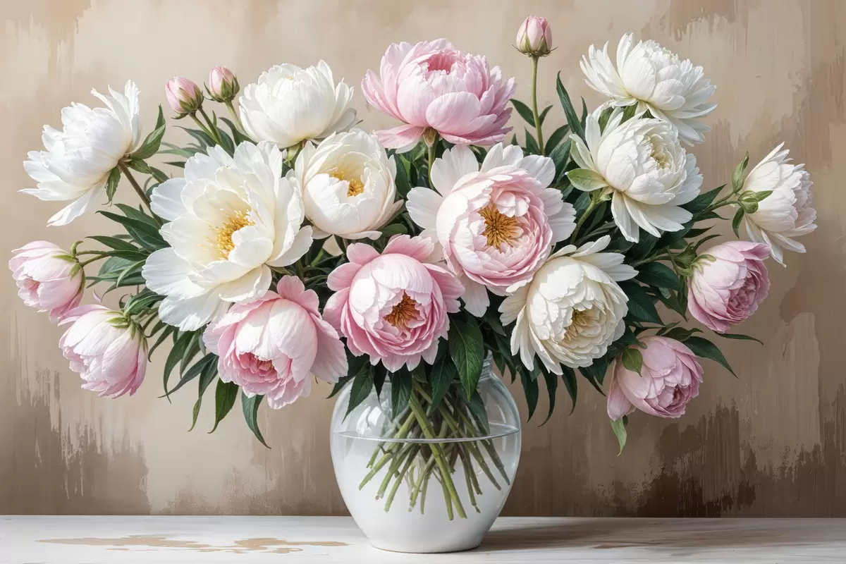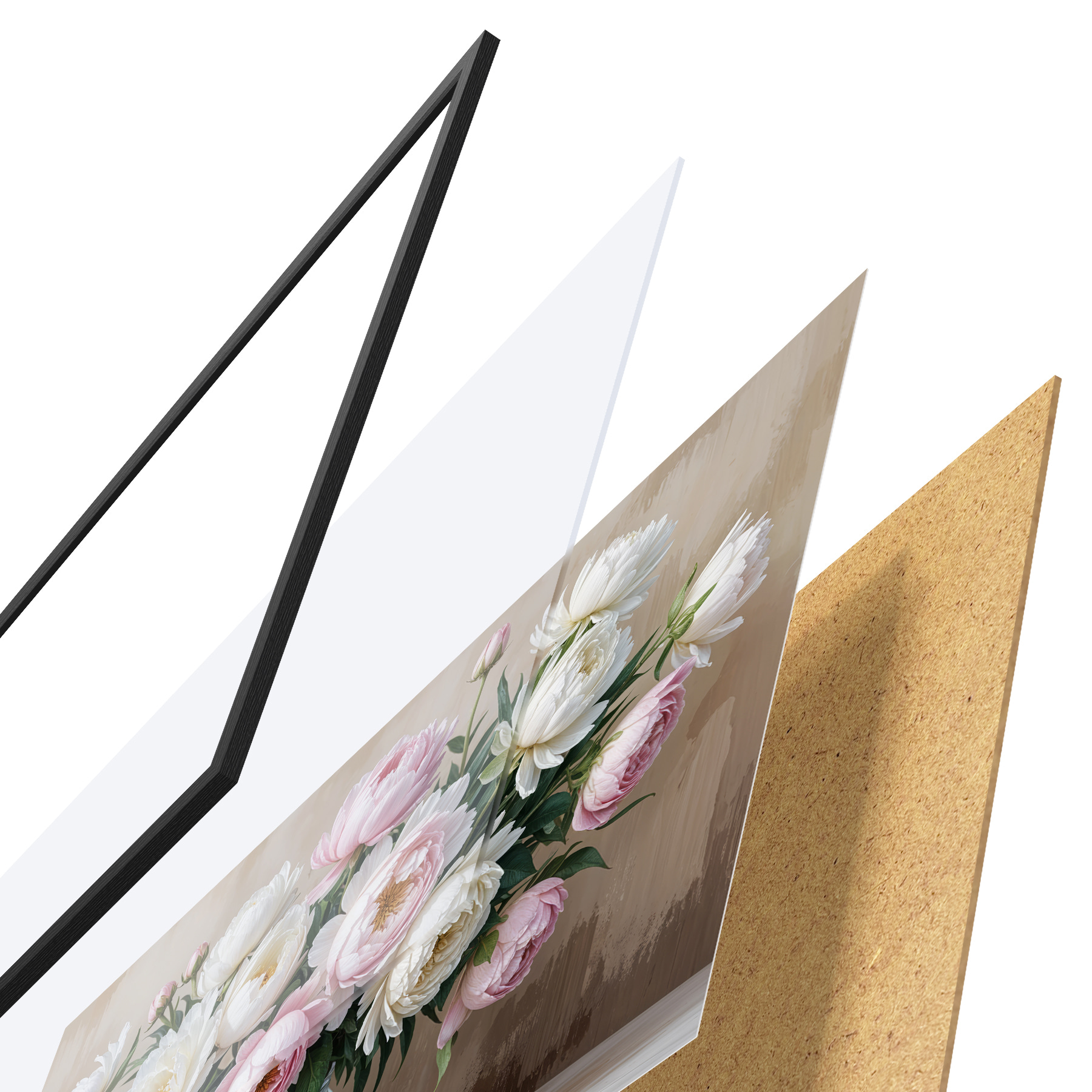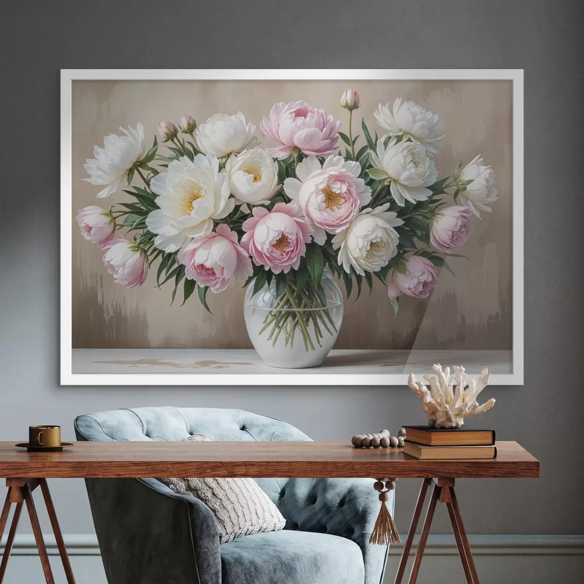 Poster Ein Strauß wunderschöner rosa und weißer Pfingstrosen in einer Glasvase, arrangiert auf einer Holzoberfläche f40398