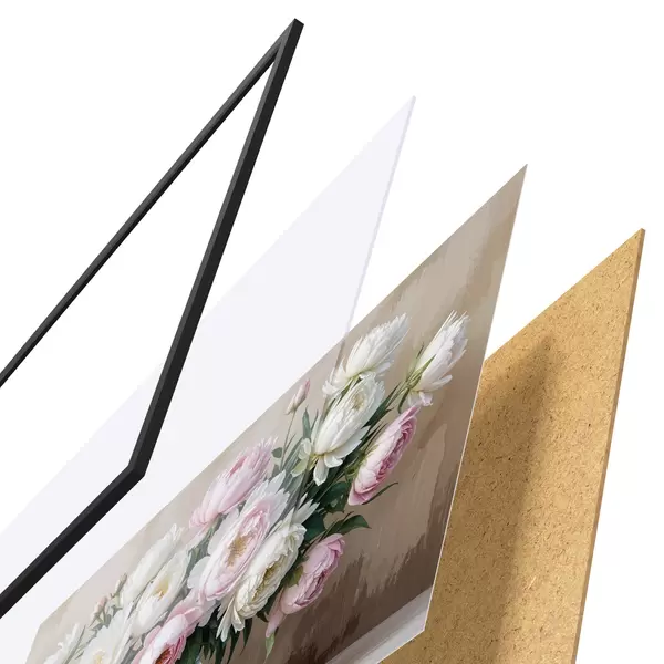 Das Poster besteht aus einem Rahmen, Plexiglas, einem gedruckten Bild und einer Rückwand aus Spanplatten. Dank der Halterungen auf der Rückseite kann das Poster sofort an die Wand gehängt werden.
