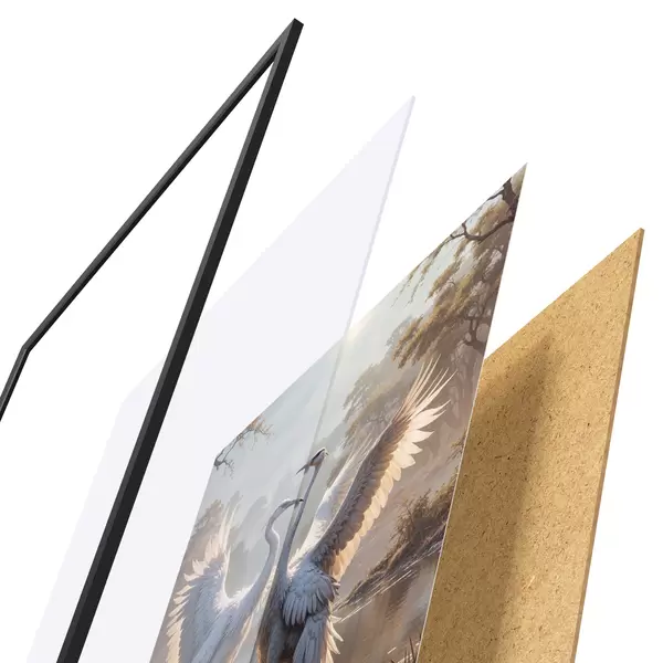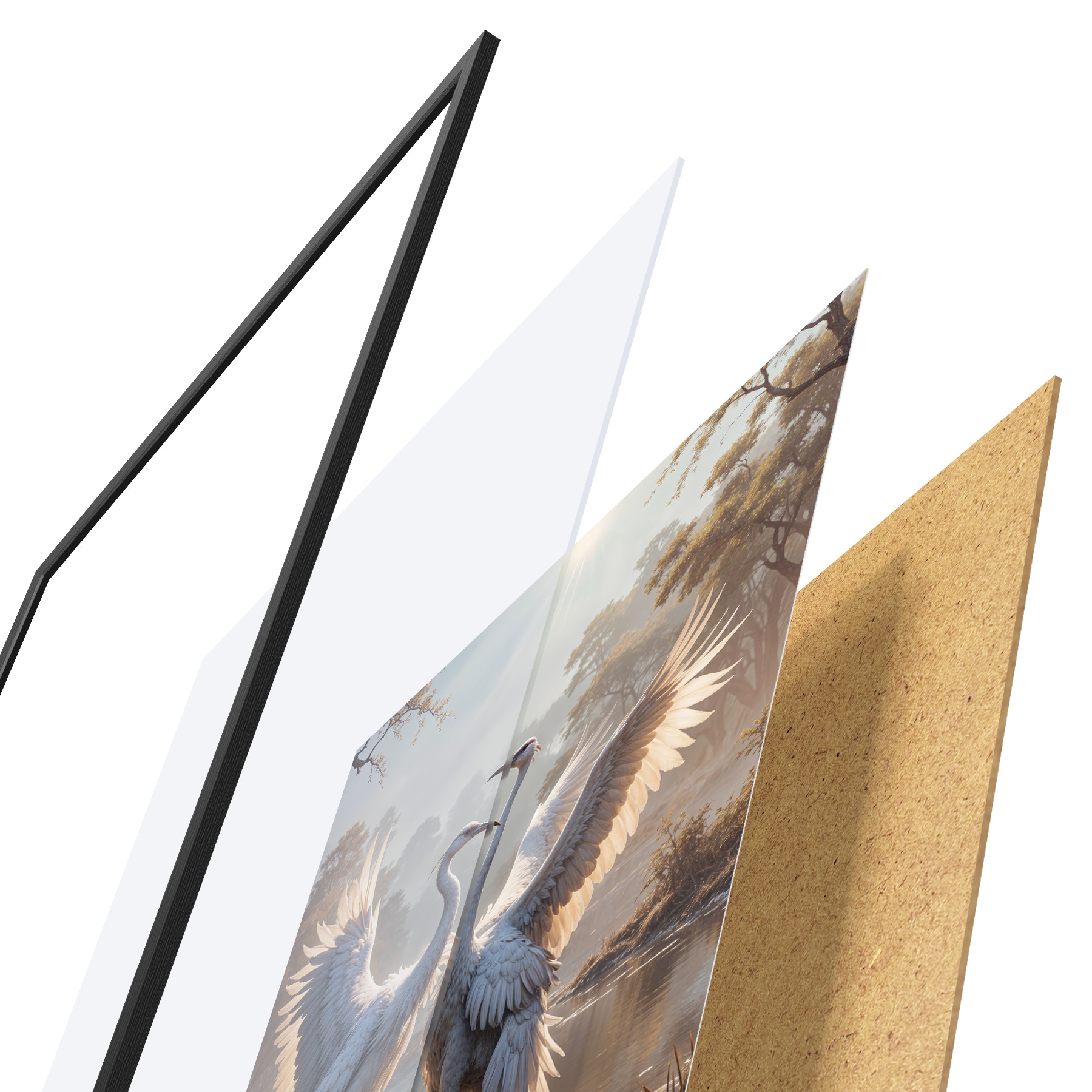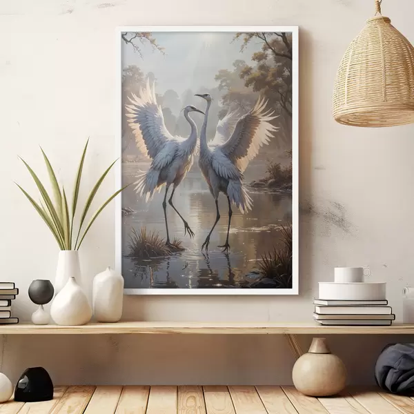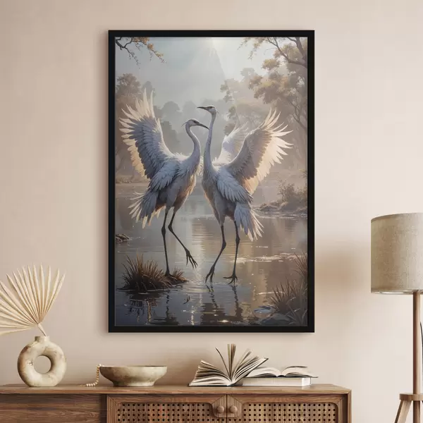 Poster Zwei große graue Kraniche mit langen Hälsen und ausgebreiteten Flügeln stehen in einem nebligen See, umgeben von Bäumen Nr f40404