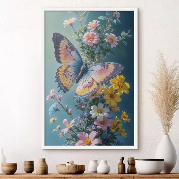 Poster Ein großer, bunter Schmetterling thront auf einem Strauß rosa und gelber Blumen vor einem dunkelgrünen Hintergrund Nr f40411