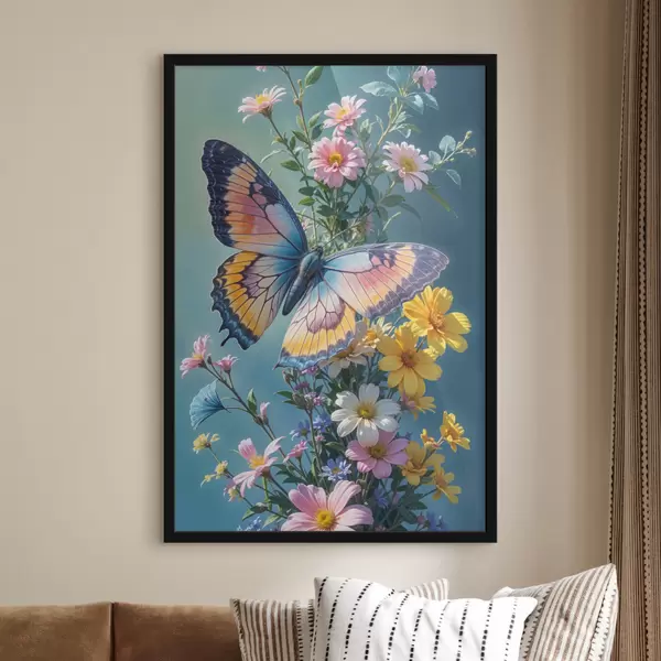 Poster Ein großer, bunter Schmetterling thront auf einem Strauß rosa und gelber Blumen vor einem dunkelgrünen Hintergrund f40411