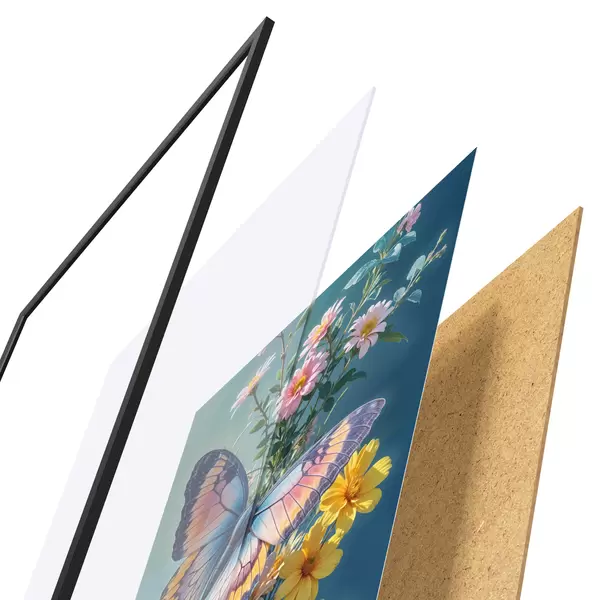 Das Poster besteht aus einem Rahmen, Plexiglas, einem gedruckten Bild und einer Rückwand aus Spanplatten. Dank der Halterungen auf der Rückseite kann das Poster sofort an die Wand gehängt werden.