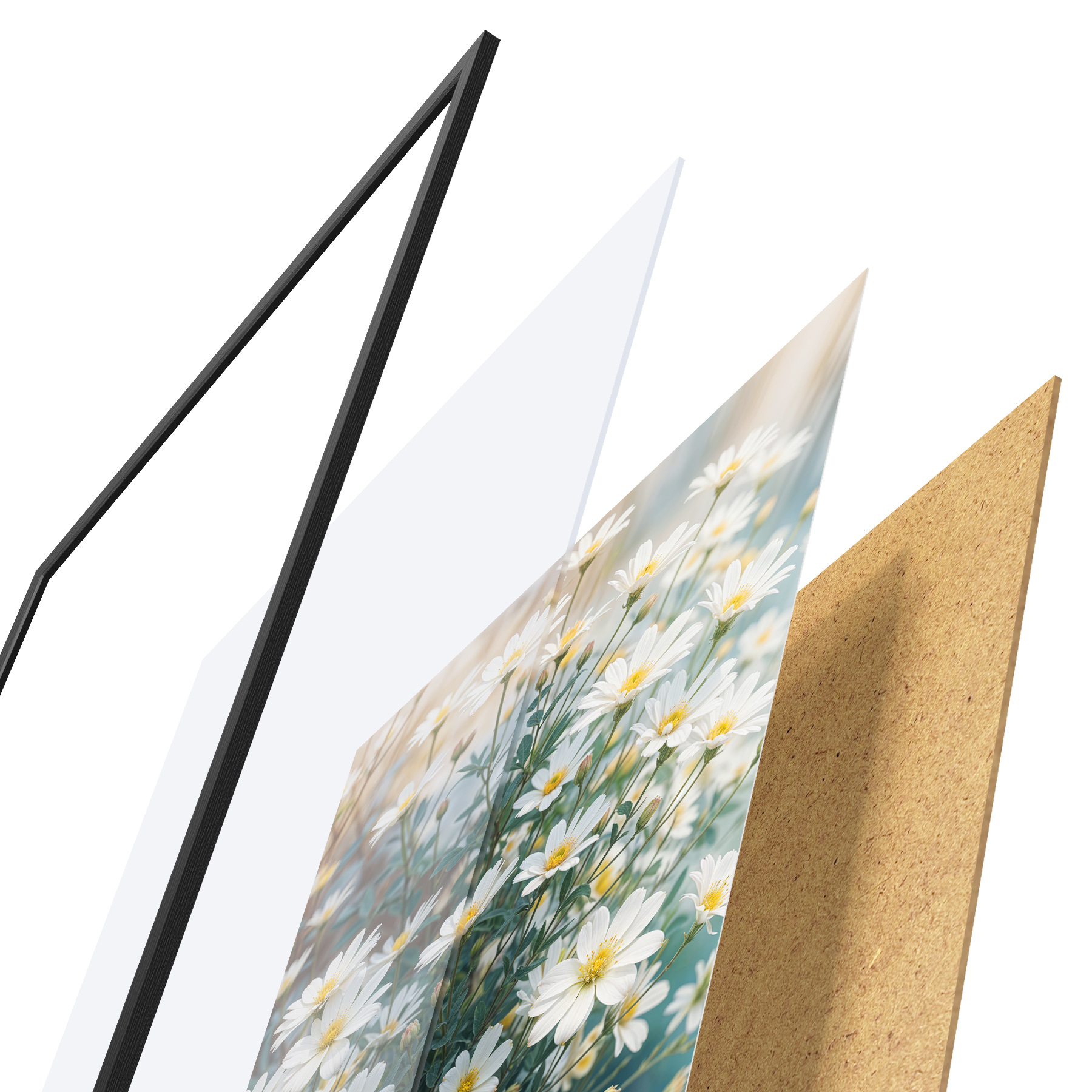 Das Poster besteht aus einem Rahmen, Plexiglas, einem gedruckten Bild und einer Rückwand aus Spanplatten. Dank der Halterungen auf der Rückseite kann das Poster sofort an die Wand gehängt werden.