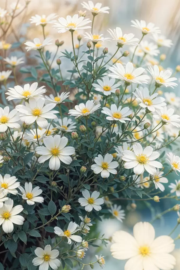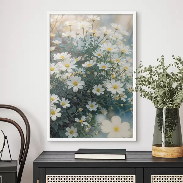 Poster Ein Feld aus weißen Gänseblümchen mit grünem Laub vor einem unscharfen Hintergrund f40413