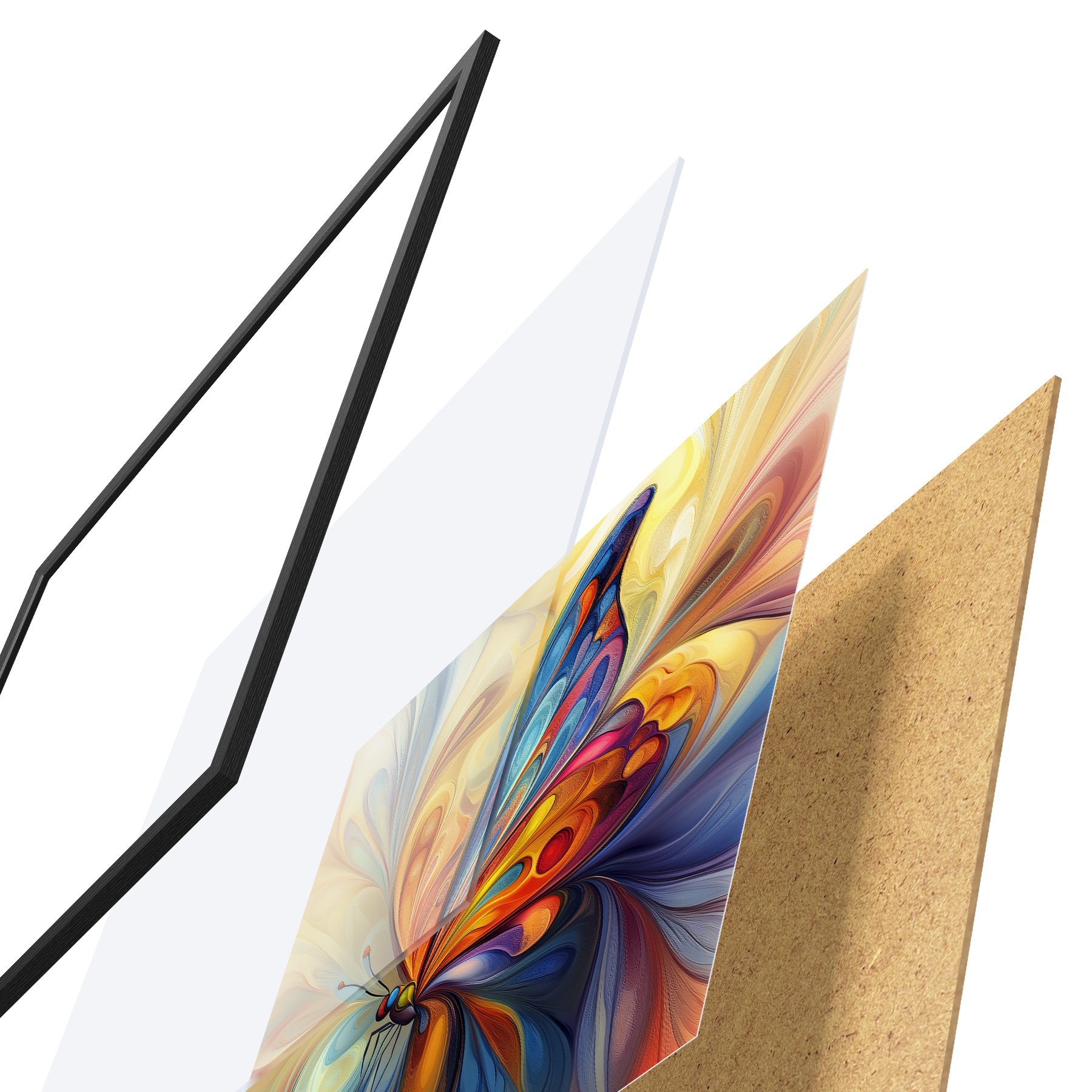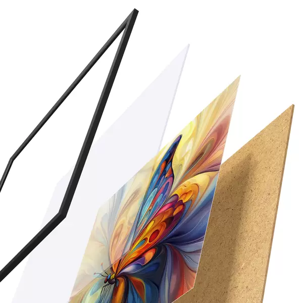 Das Poster besteht aus einem Rahmen, Plexiglas, einem gedruckten Bild und einer Rückwand aus Spanplatten. Dank der Halterungen auf der Rückseite kann das Poster sofort an die Wand gehängt werden.