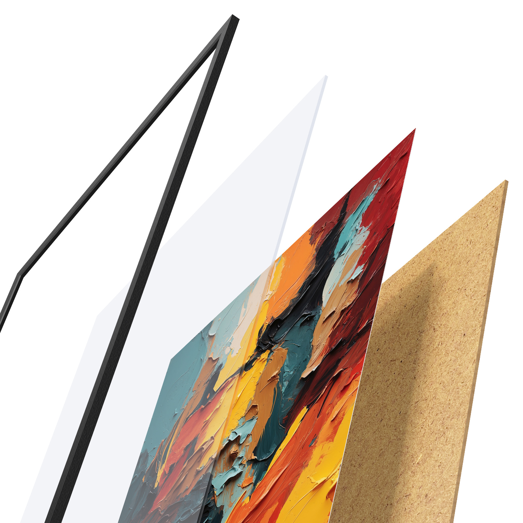 Das Poster besteht aus einem Rahmen, Plexiglas, einem gedruckten Bild und einer Rückwand aus Spanplatten. Dank der Halterungen auf der Rückseite kann das Poster sofort an die Wand gehängt werden.