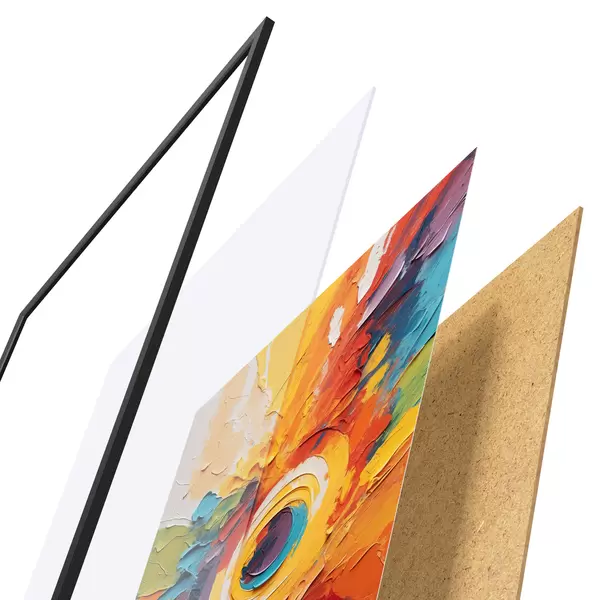 Das Poster besteht aus einem Rahmen, Plexiglas, einem gedruckten Bild und einer Rückwand aus Spanplatten. Dank der Halterungen auf der Rückseite kann das Poster sofort an die Wand gehängt werden.