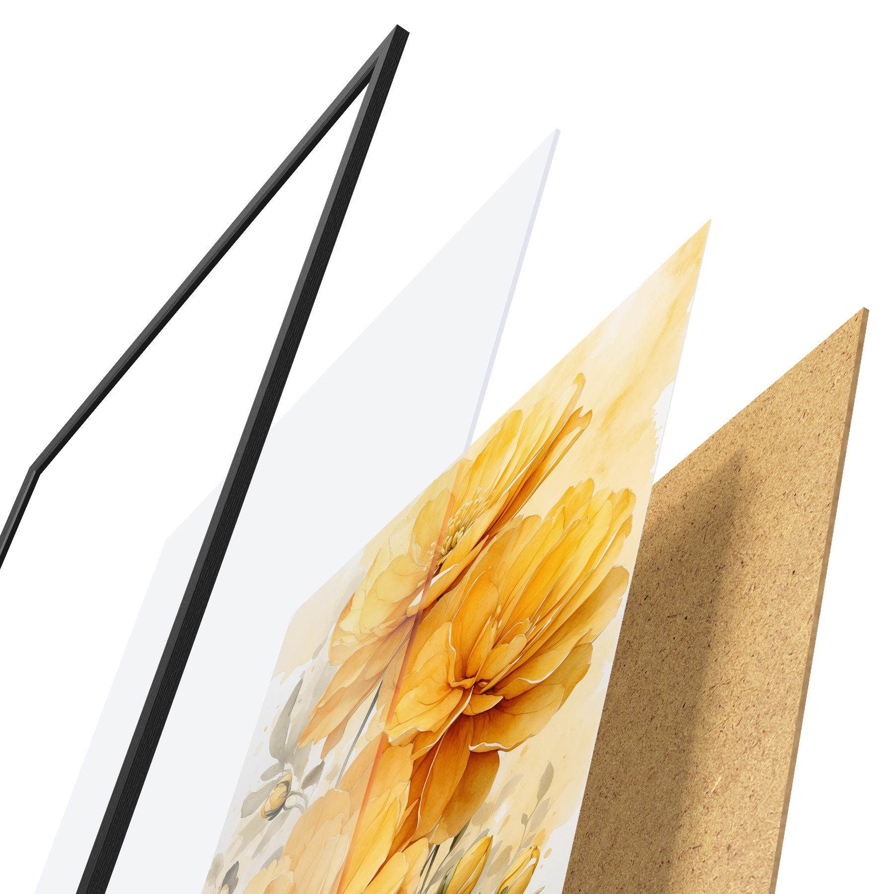 Das Poster besteht aus einem Rahmen, Plexiglas, einem gedruckten Bild und einer Rückwand aus Spanplatten. Dank der Halterungen auf der Rückseite kann das Poster sofort an die Wand gehängt werden.
