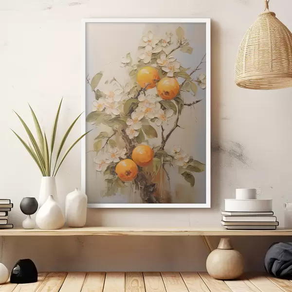 Poster Zweig mit weißen Blüten und Orangen auf graubeigem Hintergrund Nr f40486