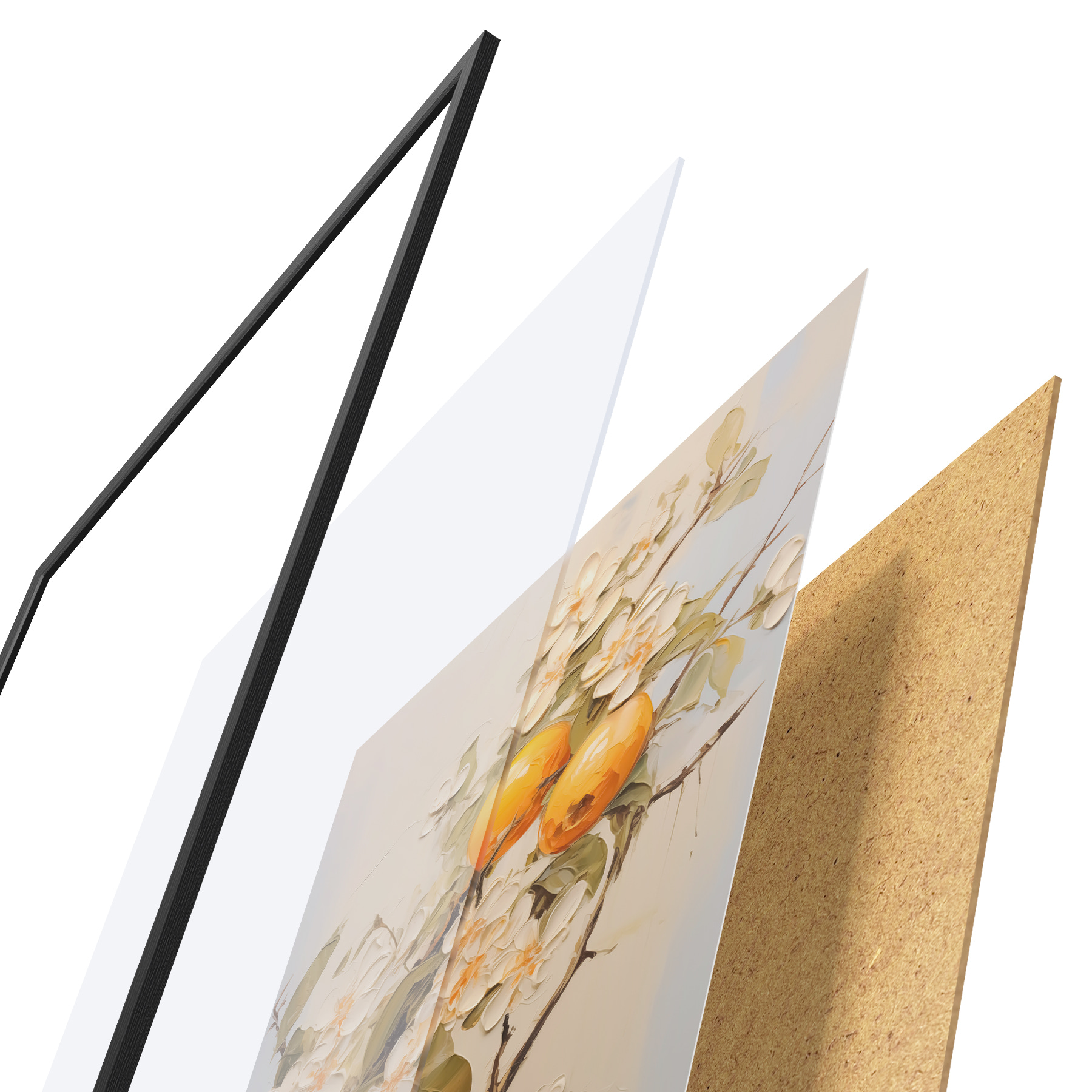 Das Poster besteht aus einem Rahmen, Plexiglas, einem gedruckten Bild und einer Rückwand aus Spanplatten. Dank der Halterungen auf der Rückseite kann das Poster sofort an die Wand gehängt werden.