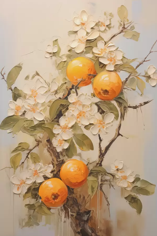 Poster Zweig mit weißen Blüten und Orangen auf graubeigem Hintergrund Nr f40486
