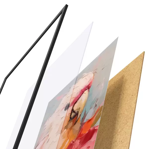 Das Poster besteht aus einem Rahmen, Plexiglas, einem gedruckten Bild und einer Rückwand aus Spanplatten. Dank der Halterungen auf der Rückseite kann das Poster sofort an die Wand gehängt werden.