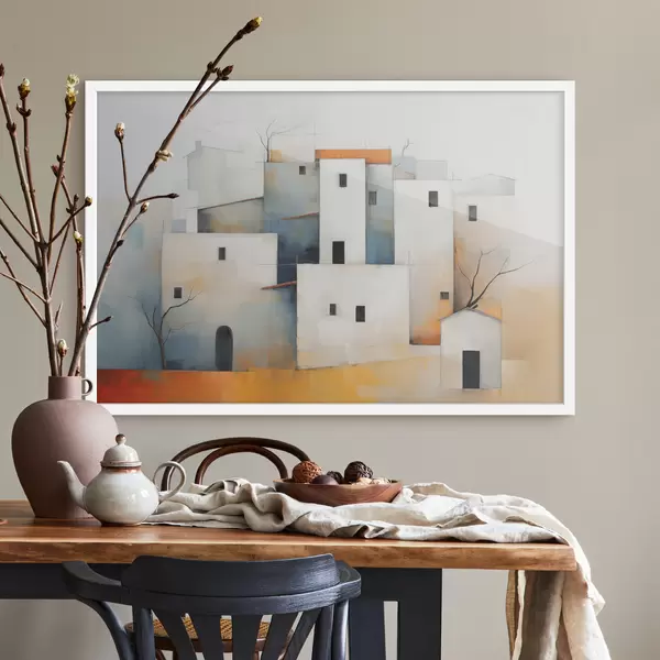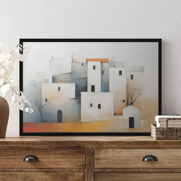 Poster Weiße stilisierte Häuser abstrakt, rot, orange, gelb, blau Nr f40531