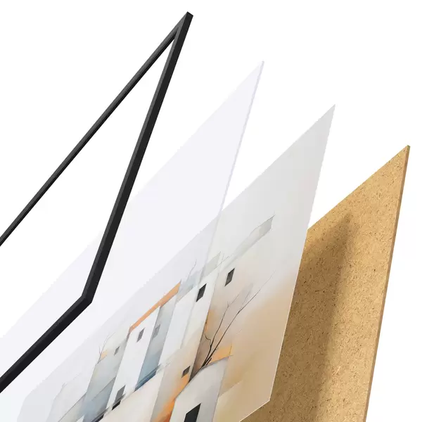 Das Poster besteht aus einem Rahmen, Plexiglas, einem gedruckten Bild und einer Rückwand aus Spanplatten. Dank der Halterungen auf der Rückseite kann das Poster sofort an die Wand gehängt werden.